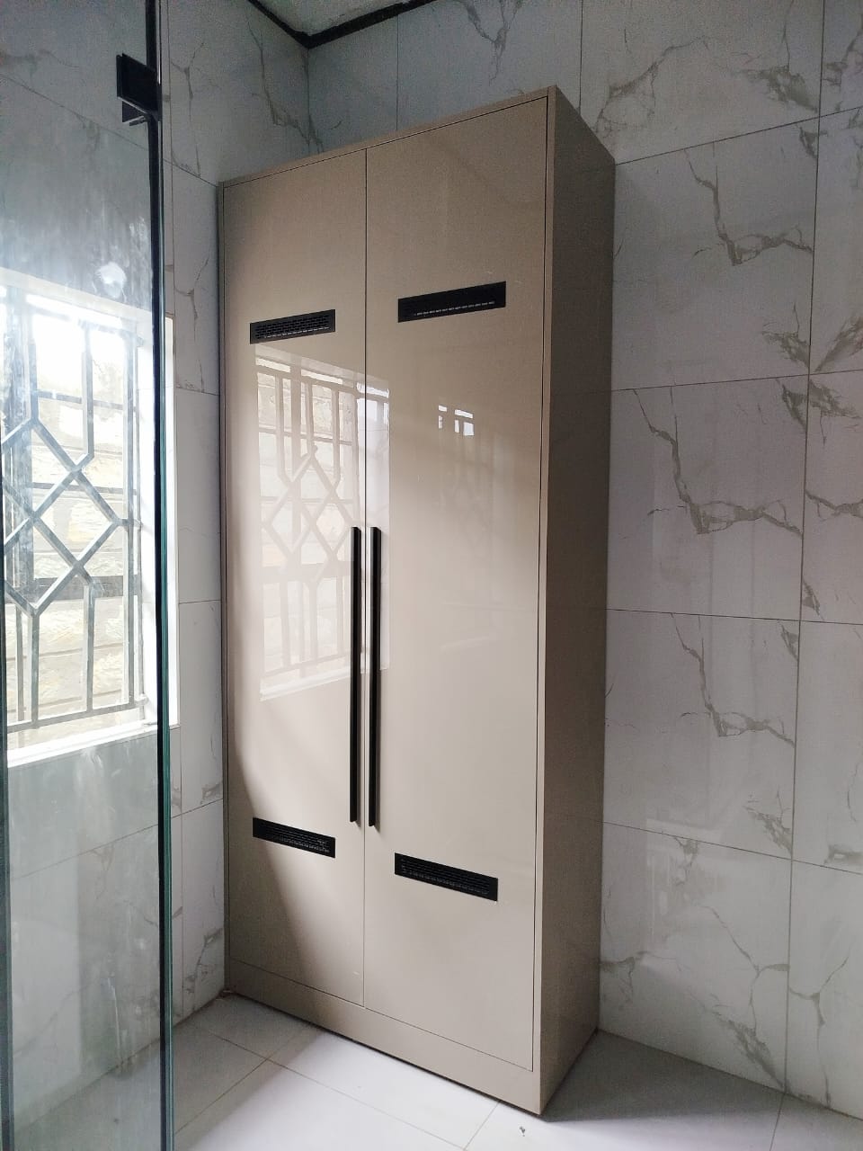 This elegant shoe storage solution exemplifies modern craftsmanship with a high-gloss finish, sleek black vertical handles, and integrated ventilation grills. Designed for both functionality and style, this unit keeps your footwear organized while enhancing the aesthetic of the space.