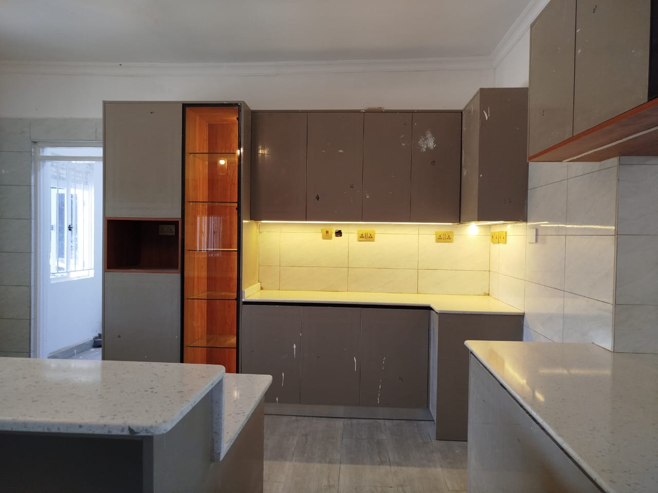- High Gloss Cabinet Finish (likely Congo color): The upper and lower cabinets have a reflective surface, giving the space a sleek, modern look. However, there are visible scratches or marks on the cabinets — might need a bit of touch-up.